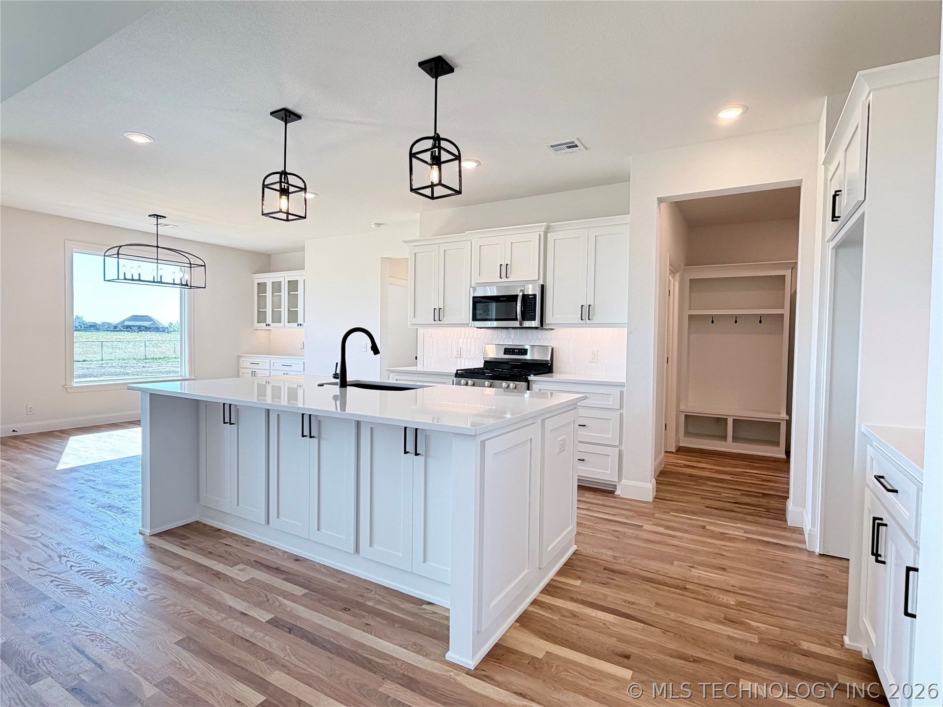 New construction home on over half an acre backing to a greenbelt in Collinsville Schools. This thoughtfully designed 3-bedroom, 2.5-bath home with dedicated office offers 2,112 square feet of functional living space with high-end finishes throughout. Real hardwood floors run through the main living areas, including the living room, kitchen, dining, office, entry, hallways, and primary bedroom, with carpet in the two secondary bedrooms. The open-concept layout features a spacious kitchen with a large island offering exterior storage, walk-in pantry, and a designated dining area with built-in cabinetry and display cabinets. Abundant natural light highlights the clean, modern design and upgraded lighting package. The primary suite includes a spa-like bathroom with oversized walk-in shower, built-in bench, and an expansive three-tier walk-in closet. Additional features include a large laundry room with extra storage closet, half bath off the kitchen, and a 3-car garage. Enjoy outdoor living on the oversized covered back patio overlooking the greenbelt. Move-In Ready by April 30, 2026.